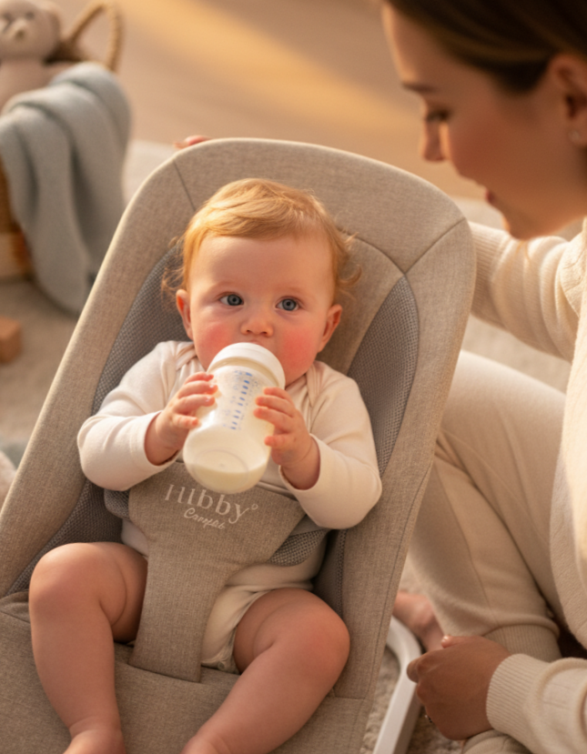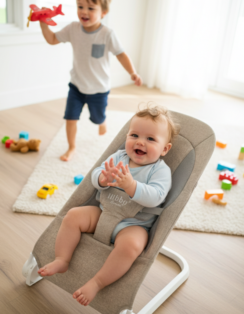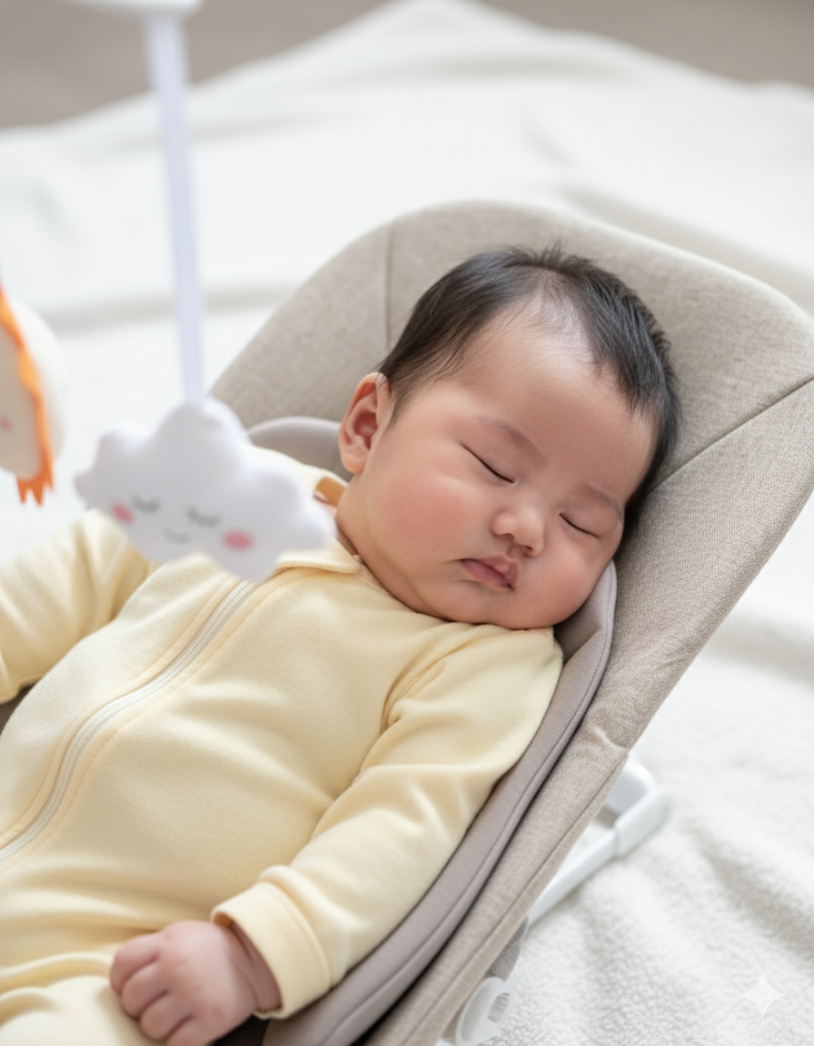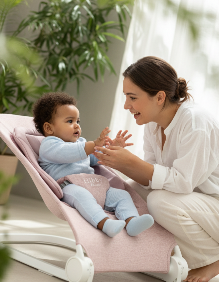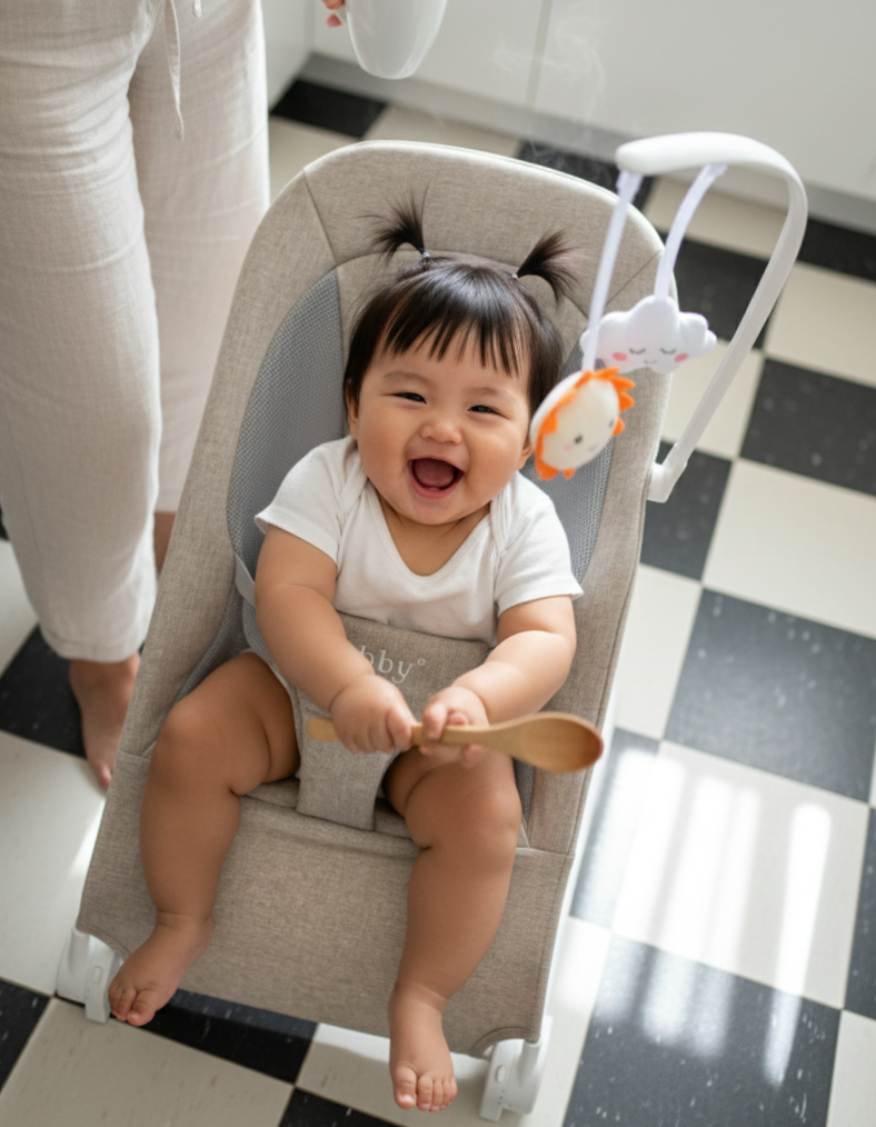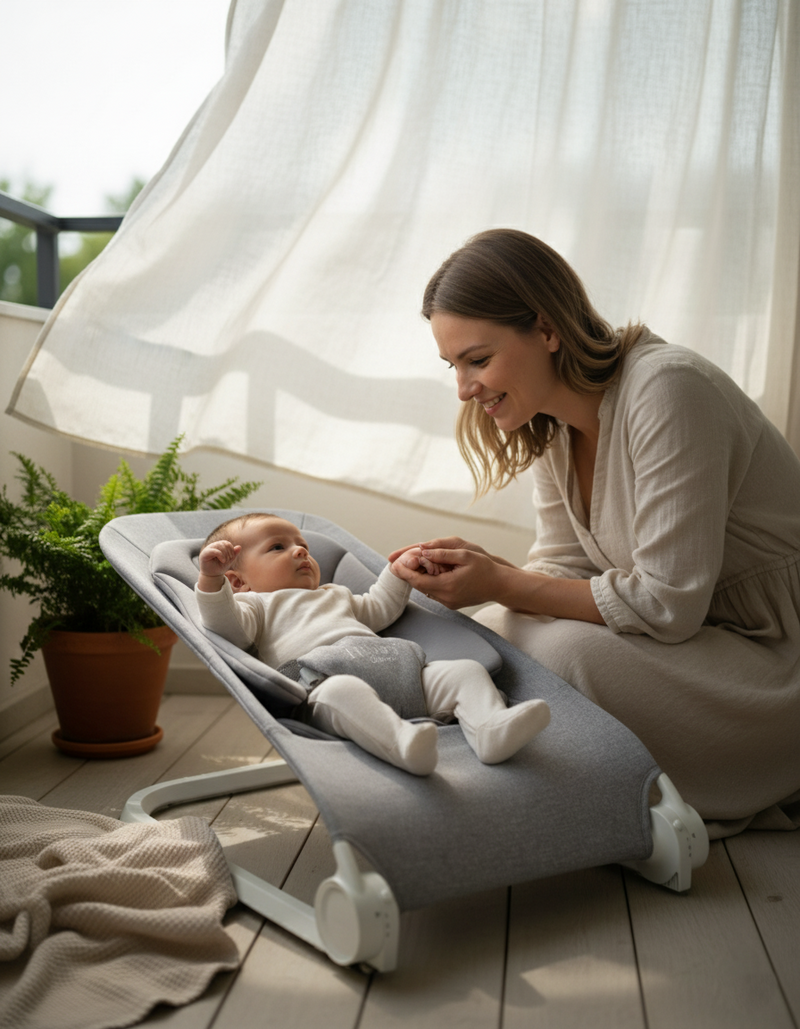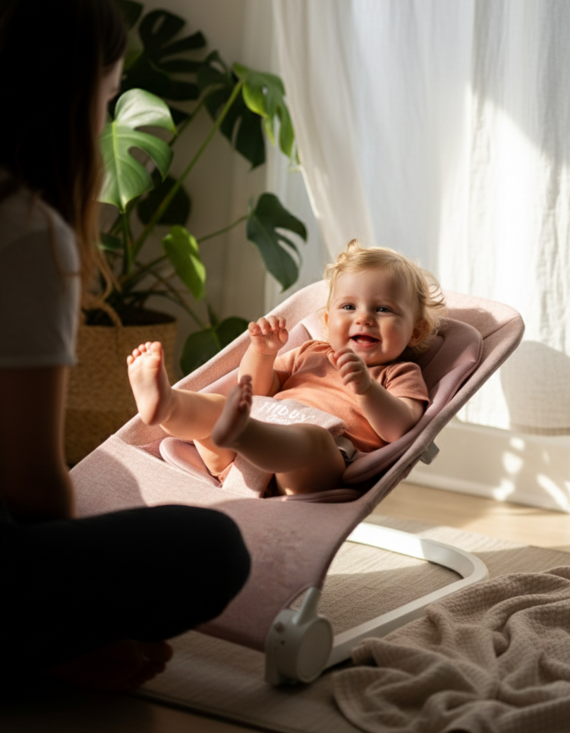 Your 15-Minute Peace Plan. The chic, battery-free bouncer that safely soothes baby while giving you a much-needed moment back.